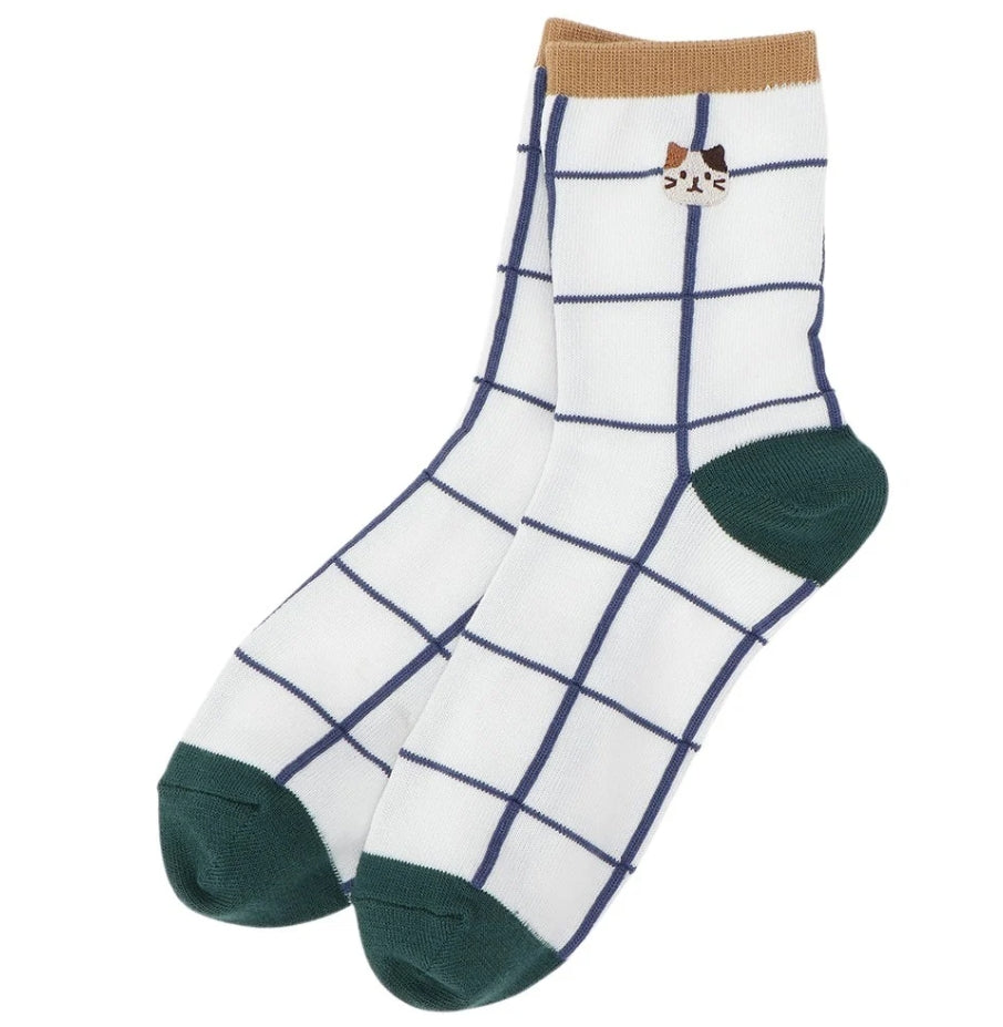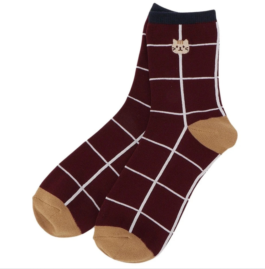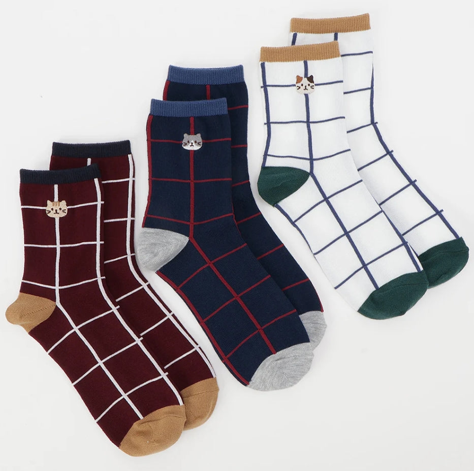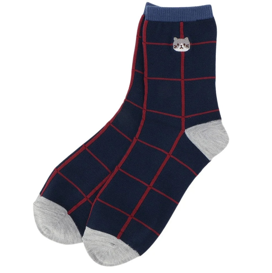 秋冬定番のソックスです。クラシックなチェック柄と猫モチーフの刺繍が特徴で、レトロながらもとてもキュートな印象です。