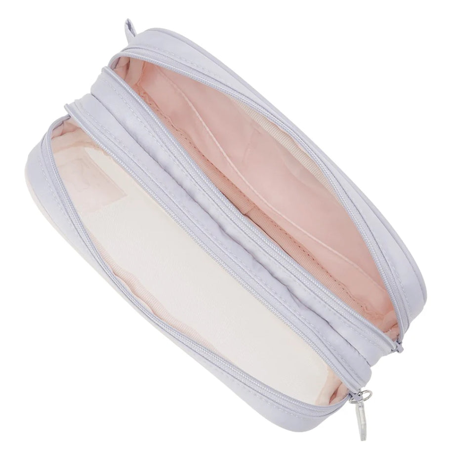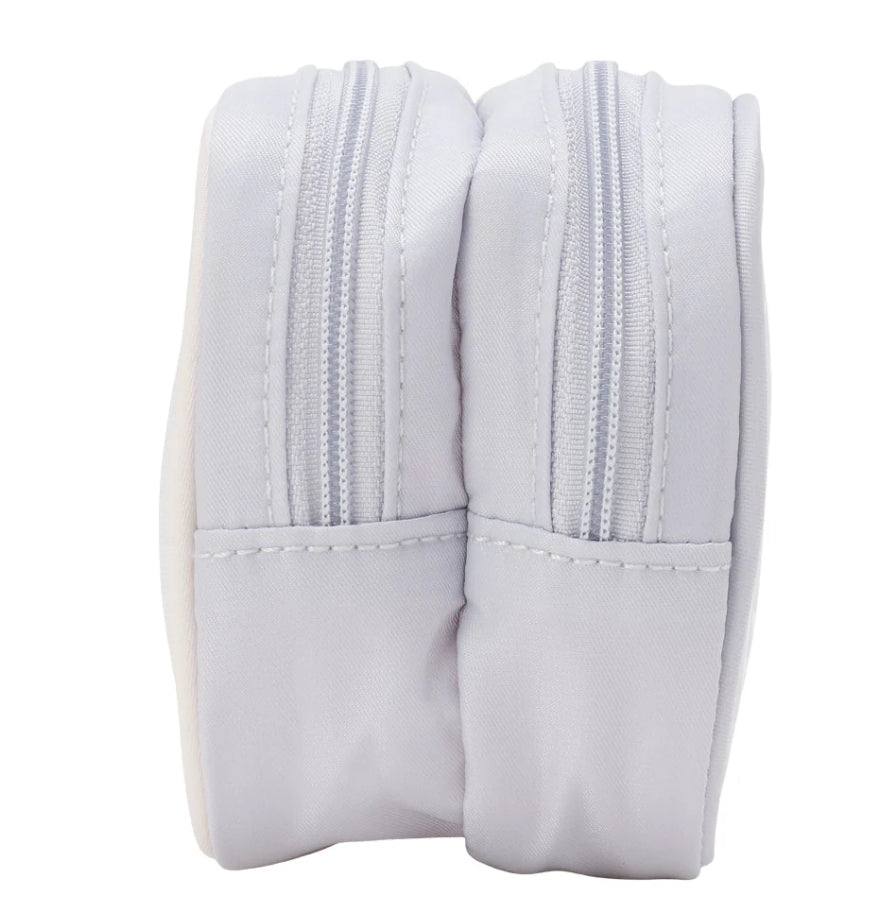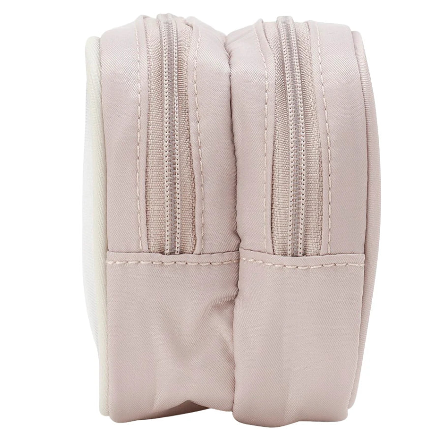 ペン、付箋、小さなメモ帳などを分けて収納できる二重構造。文具バッグやコスメポーチとしても使えます。