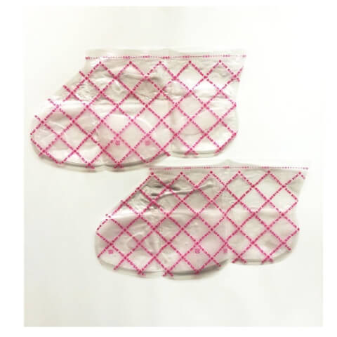 (2)袋に足を入れ、付属のテープで足首などの緩んだ部分を固定します。※ローションが足裏にしっかり密着するよう、足が床に接していることを確認してください。※ローションが床材に付着すると変色する恐れがあります。必ずタオルなどを敷いた上に足を乗せてください。