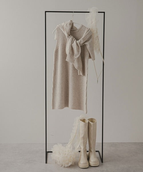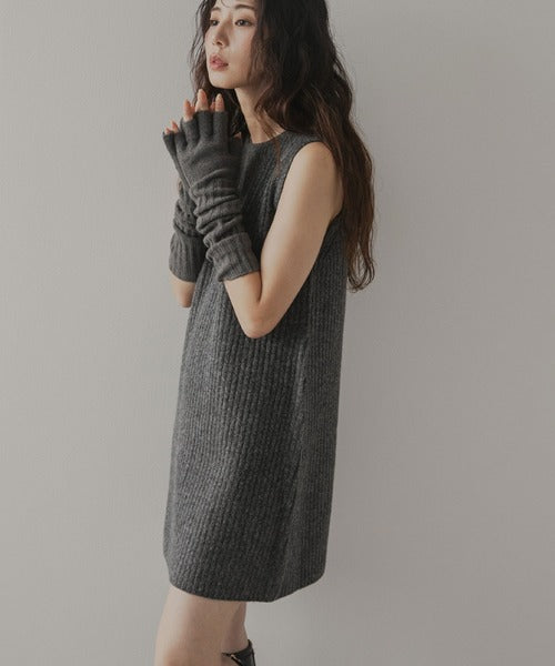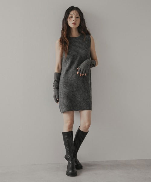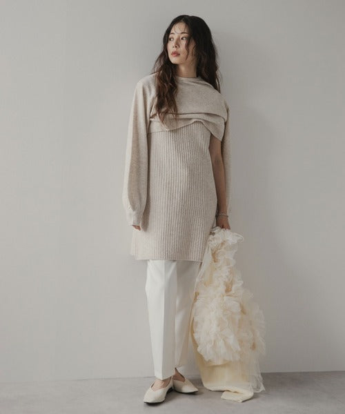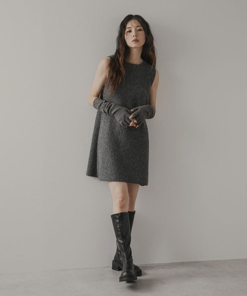 極簡主義風格的連身裙套裝,包括一件帶有垂直羅紋的無袖連身裙和一件可以前後兩種方式穿著的蝴蝶結開襟衫。