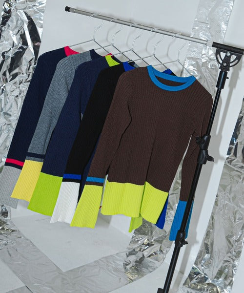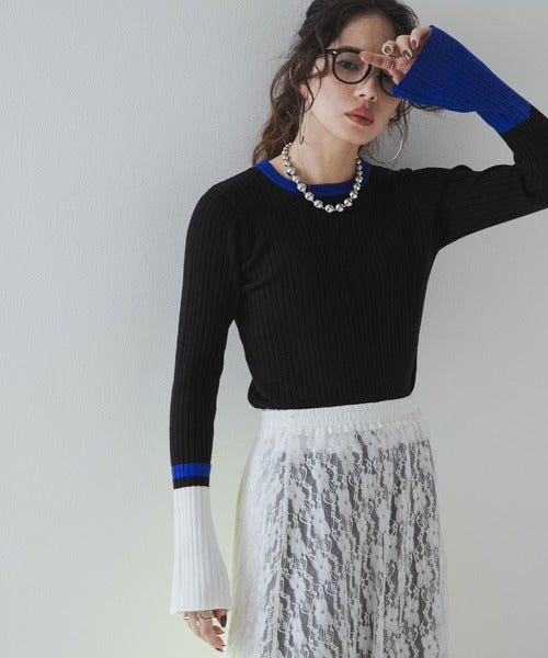 喇叭袖配色套頭針織衫