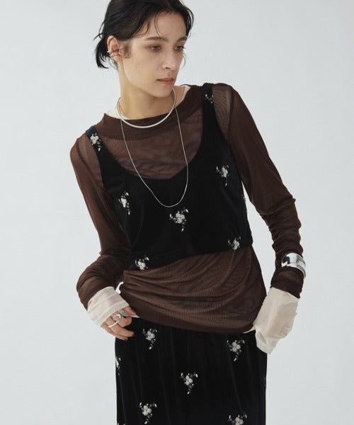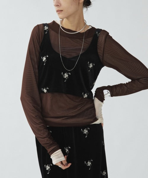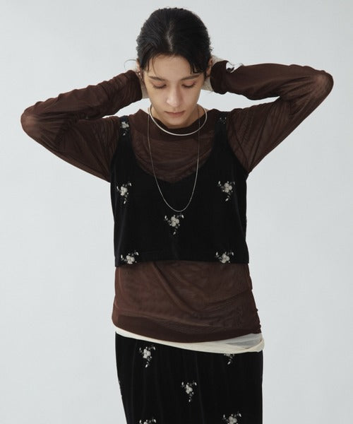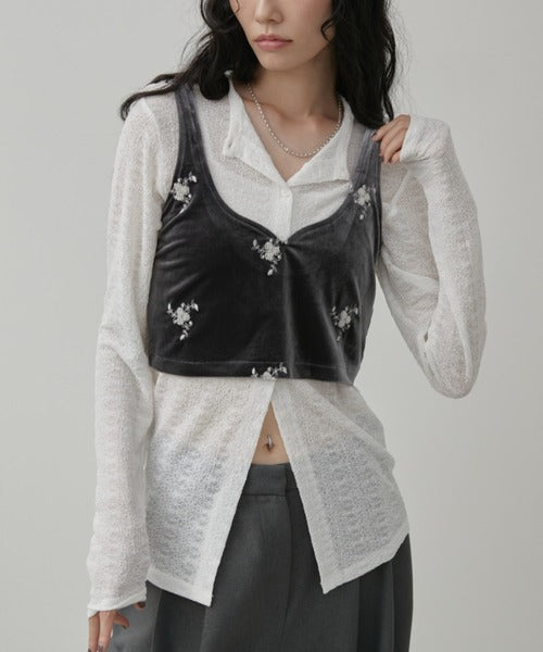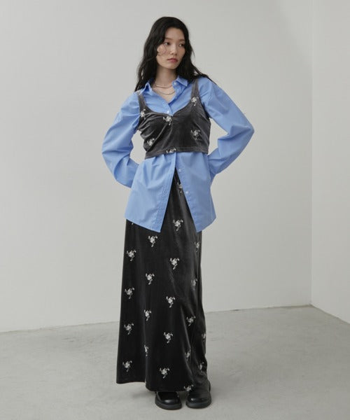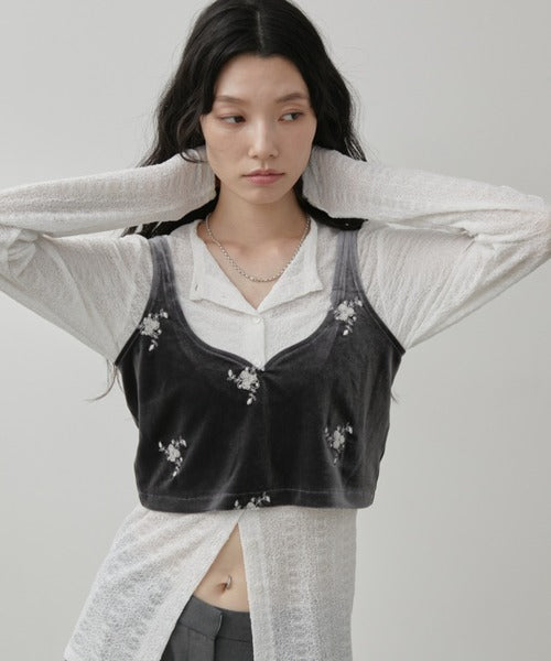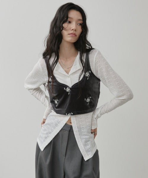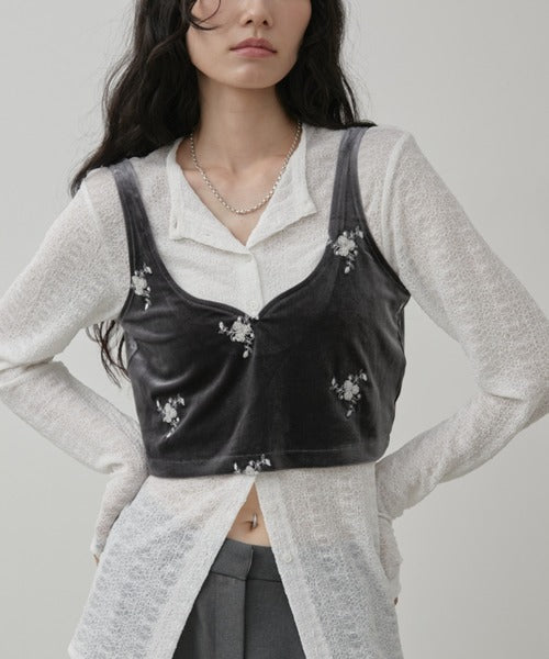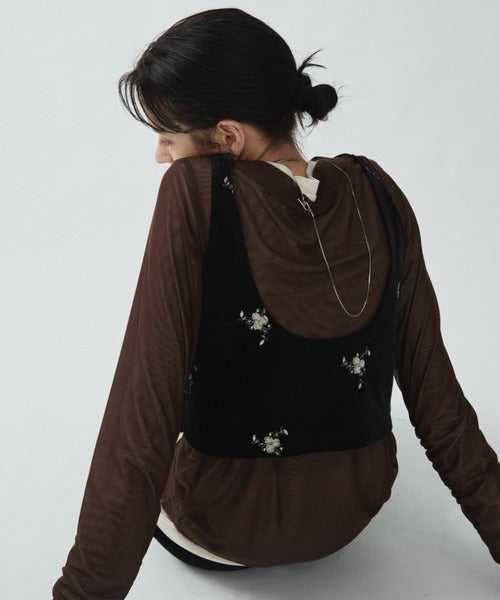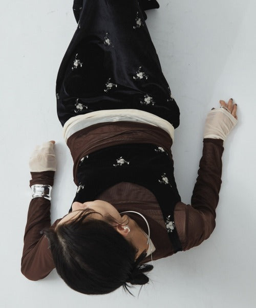 緊身胸衣採用柔軟的天鵝絨材料製成,並帶有花卉刺繡。